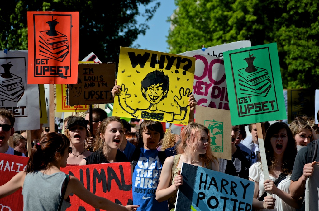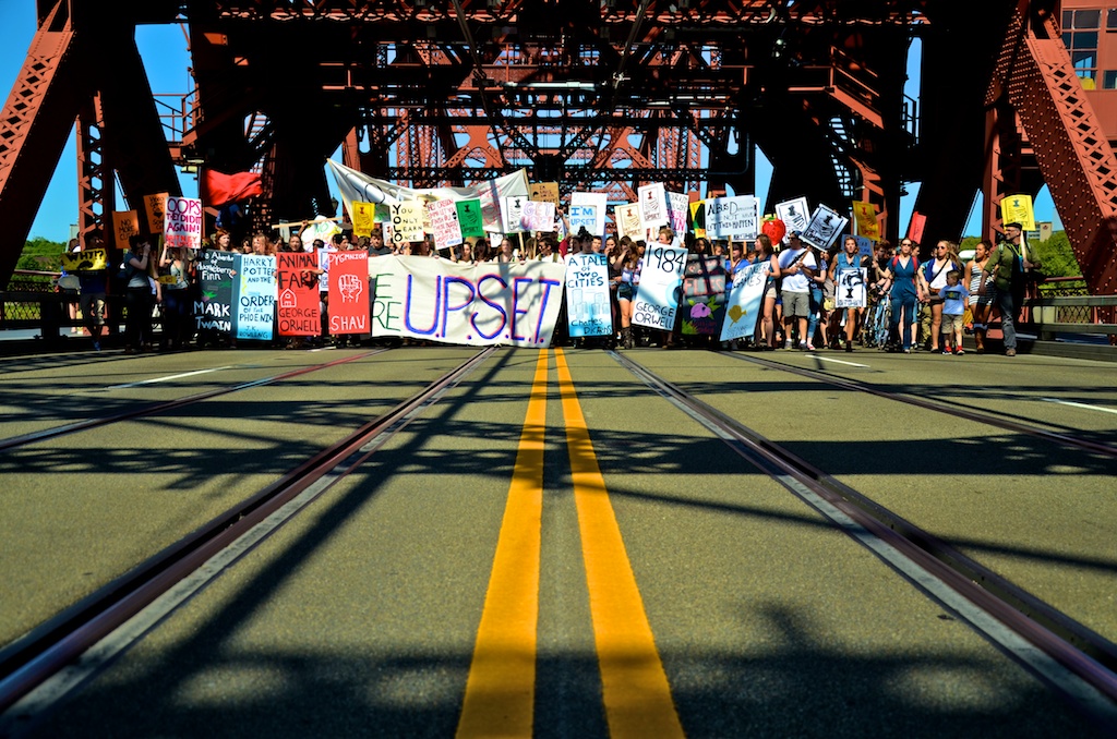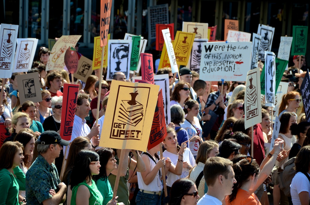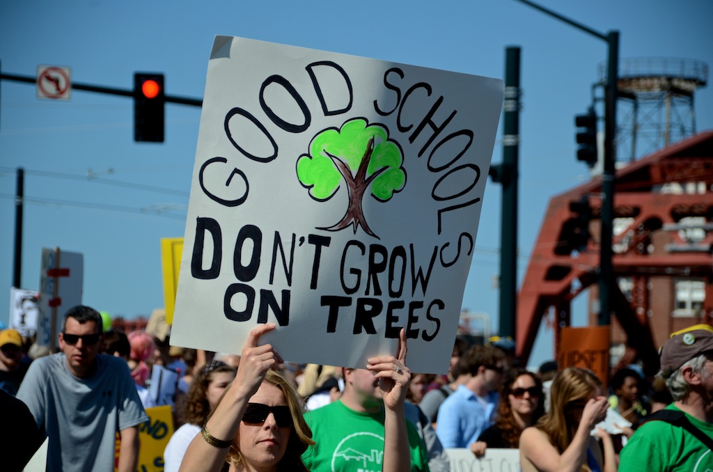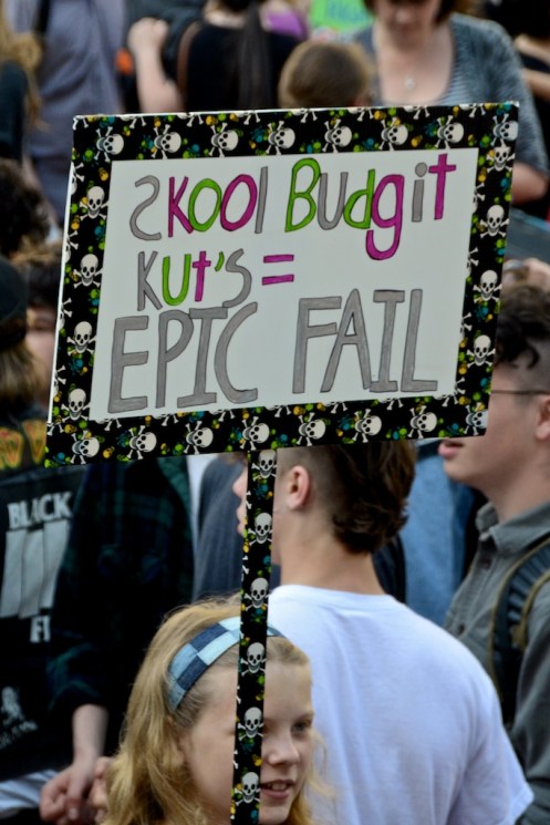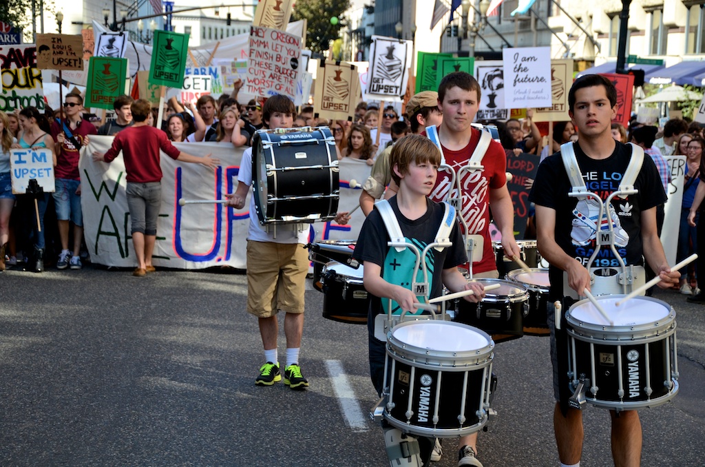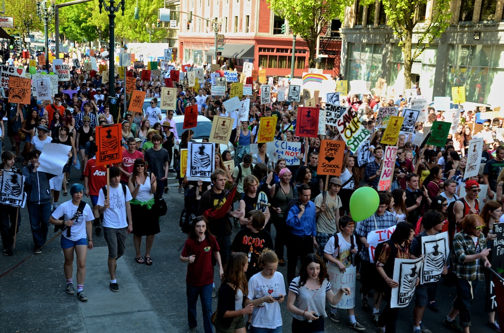 Over 1000 High School students marched through Portland, OR to protest ongoing budget cuts, teacher lay-offs, school closures, and reductions in programs.