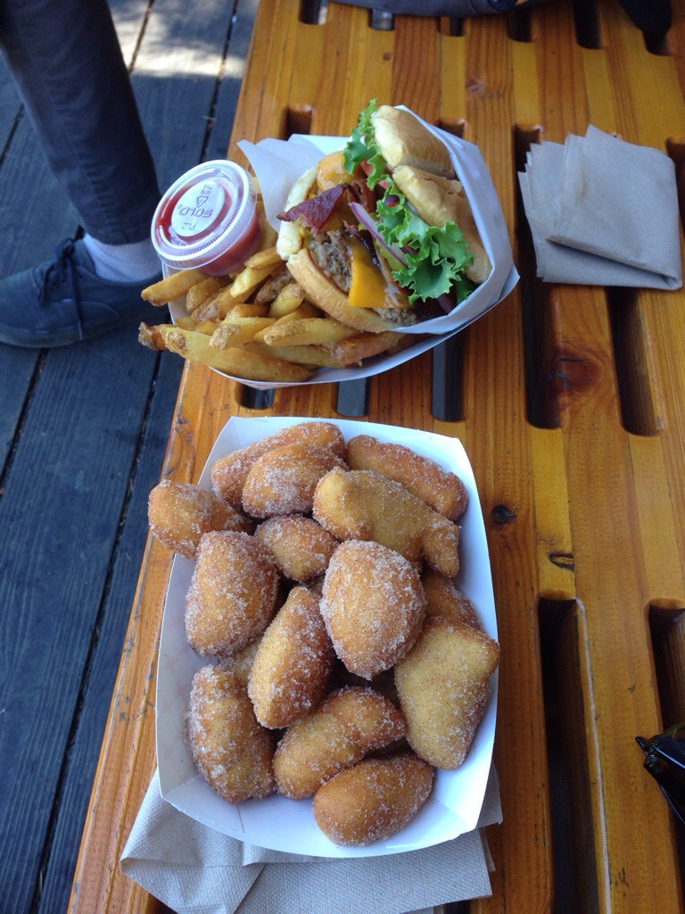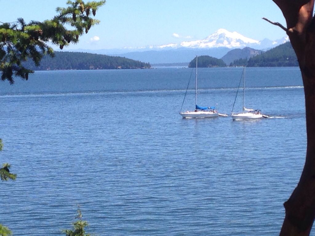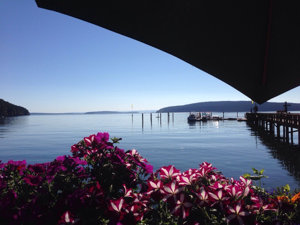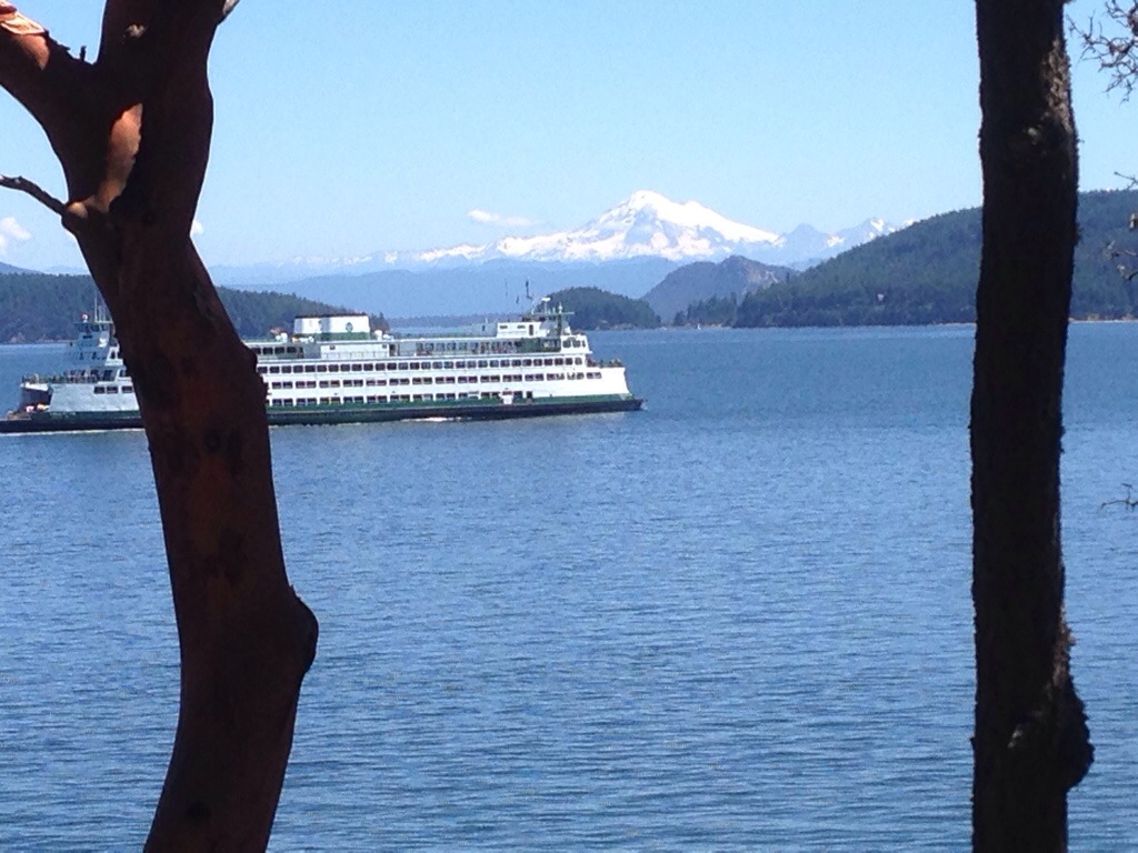 Today we cycled a short 4 miles to the ferry dock at Lopez Island, ate a delicious burger and deep fried, sugar coated, dough bits, took the ferry to Orcas Island, and then biked the 10, hilly miles to West Beach Resort just outside of Eastsound. The day was hot, but beautiful and we are spending the evening relaxing on the waterfront deck with a cold beverage!