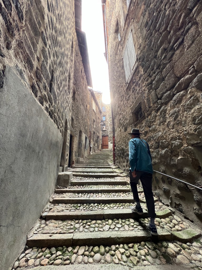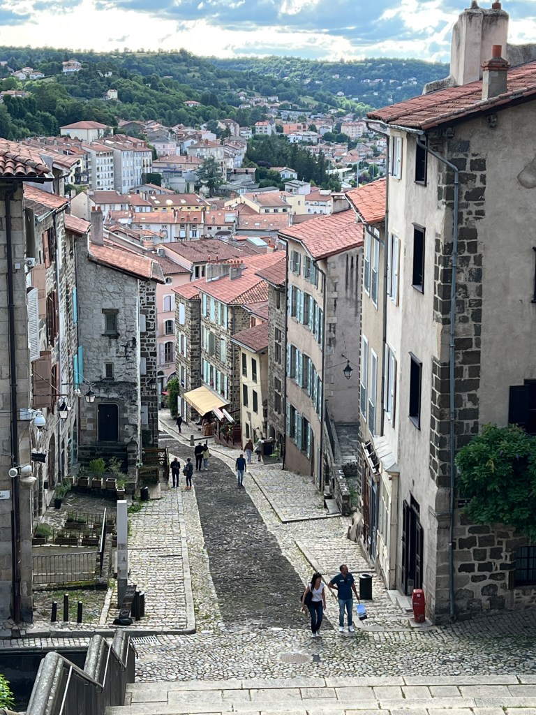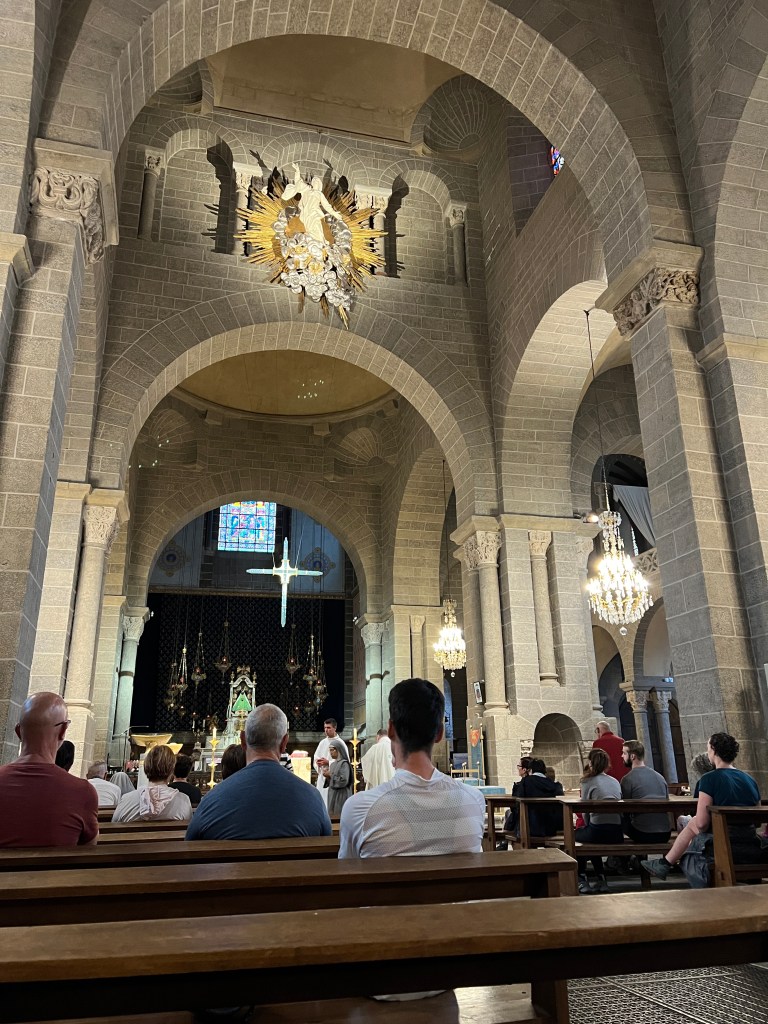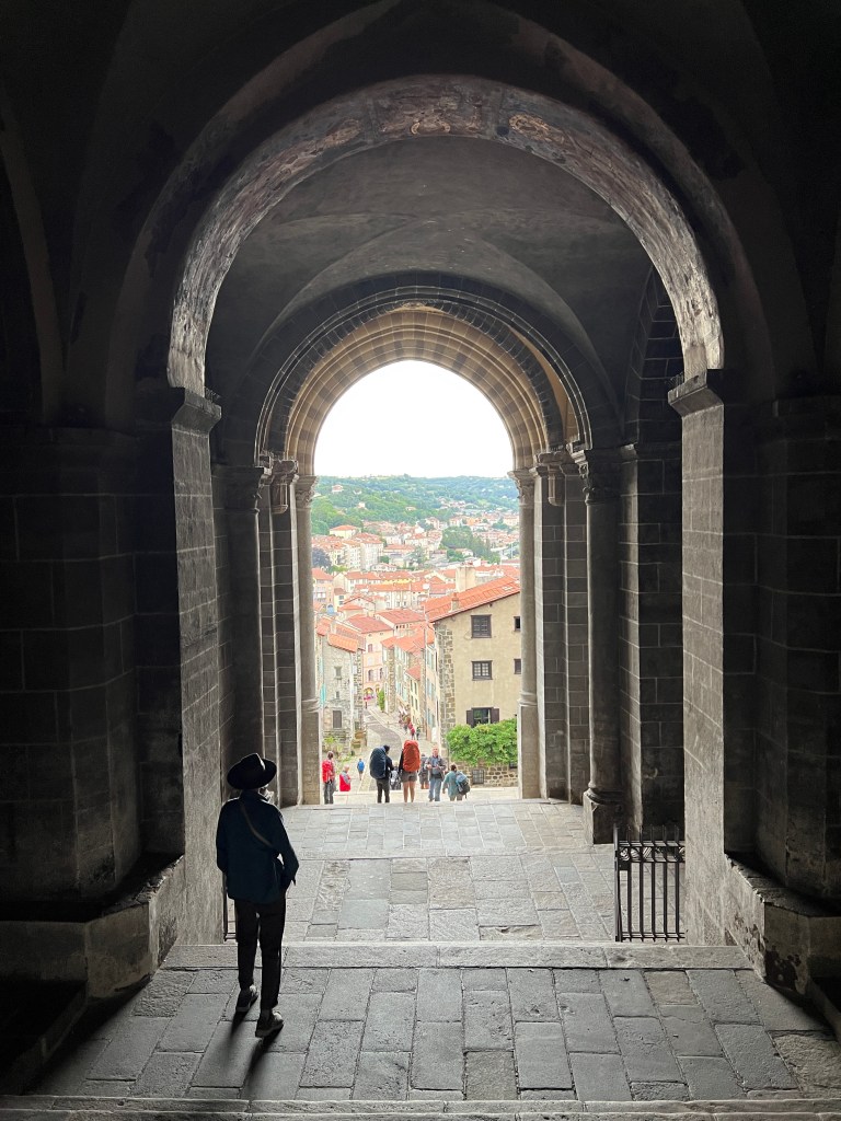 Le Puy was stunning; a town built on ancient volcanic hills and spires. The Via Podiensis begins at the Cathedral, which sits atop the town and is accessed by walking up winding cobblestone streets and multiple sets of staircases. There is a daily morning mass for pilgrims that begins at 7am and includes a blessing for the journey ahead. I am not Catholic, but enjoyed the ritual and community aspect of the gathering. At the end of mass large metal gates in the floor open up and reveal a staircase leading out of the church to begin the walk. It’s dramatic and symbolic and an exciting start to the walk.
