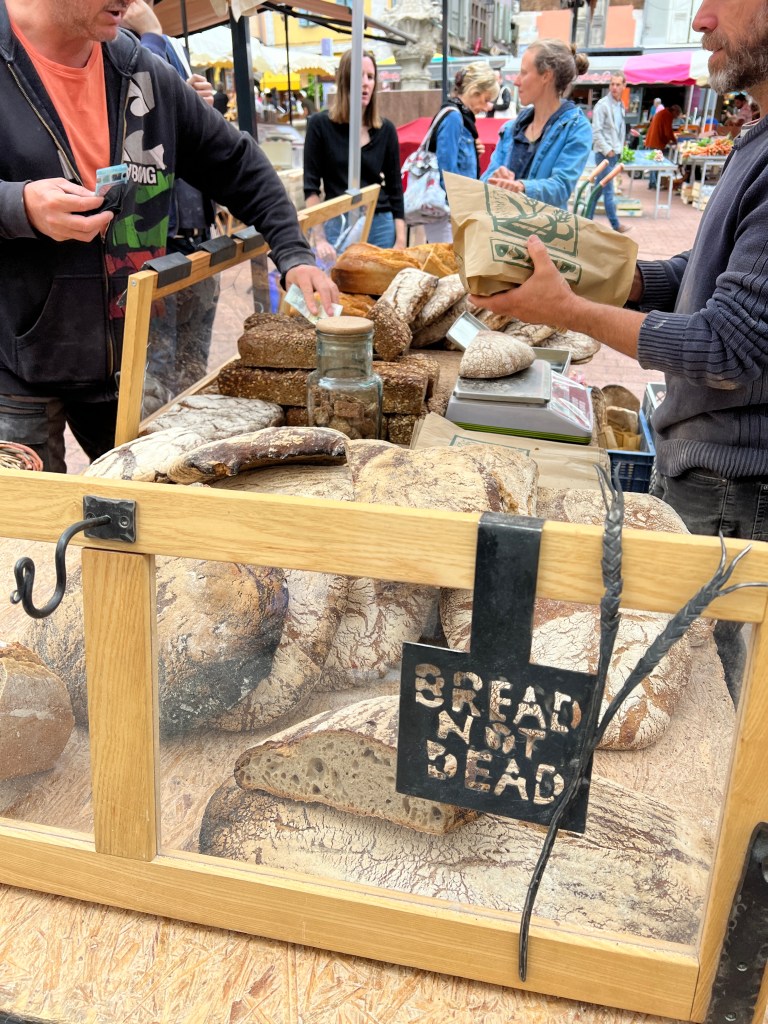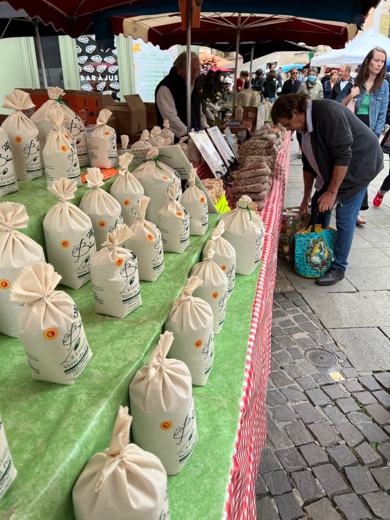 We had the privilege of starting our walk on market day, which was in the small town square filled with vendors of all kinds. We bought some trail mix and dried fruit, but the bread and cheese and roast chicken and endless rows of fruits and vegetables looked delicious!