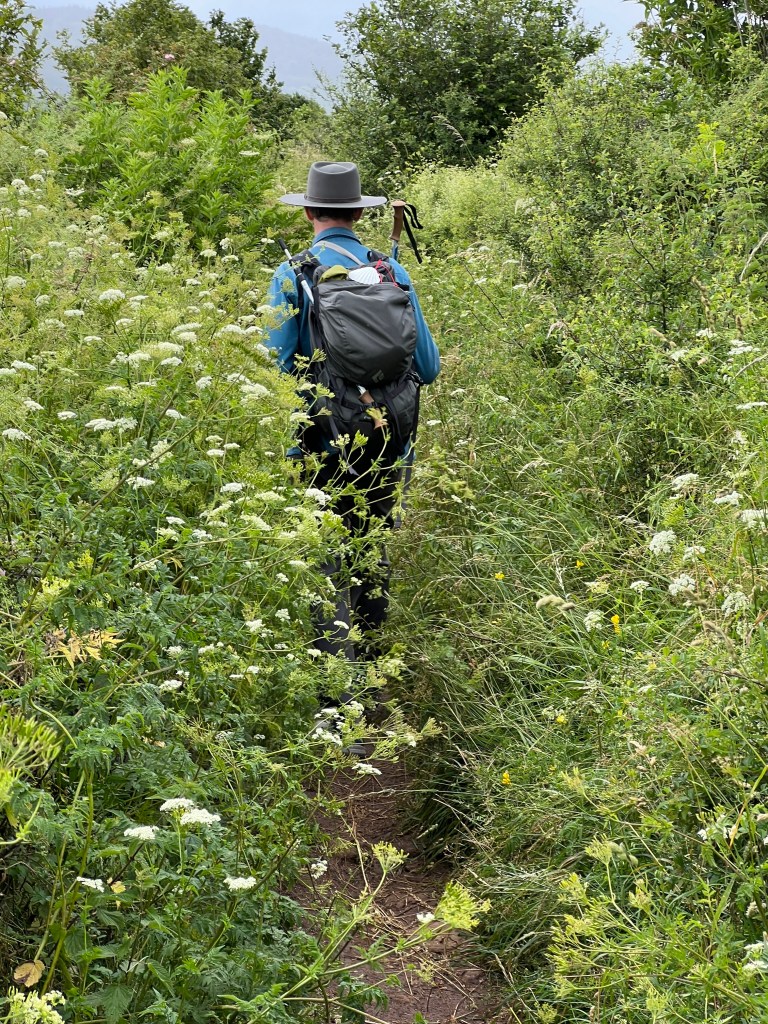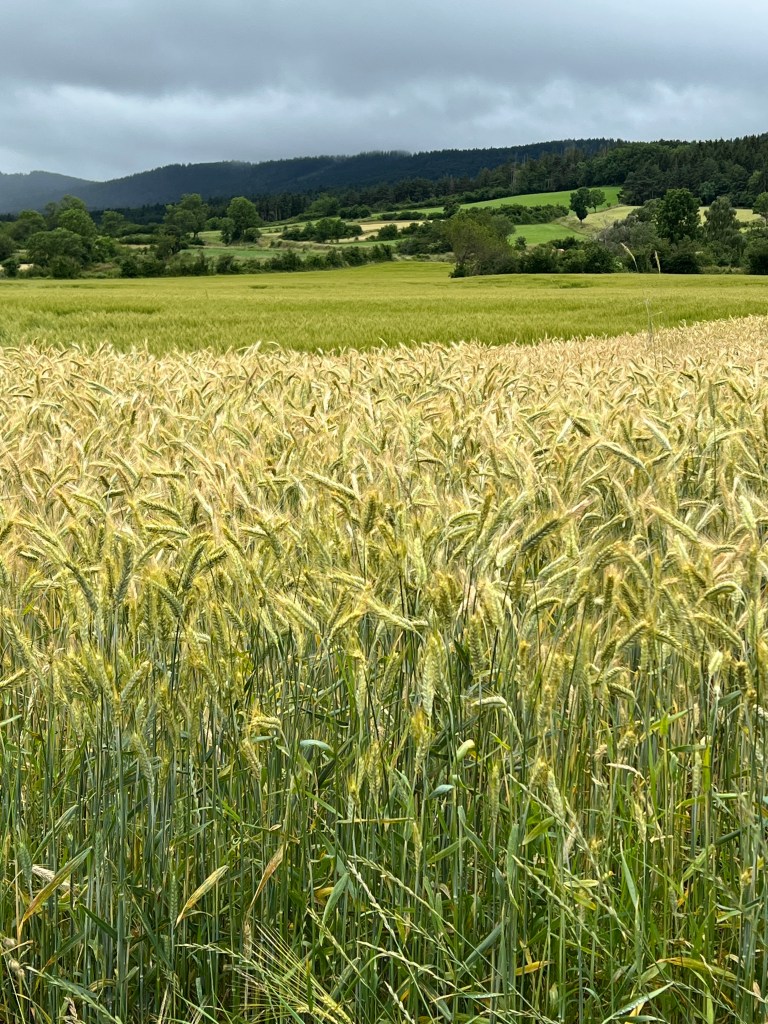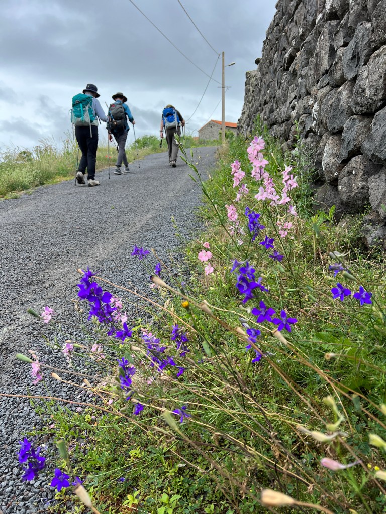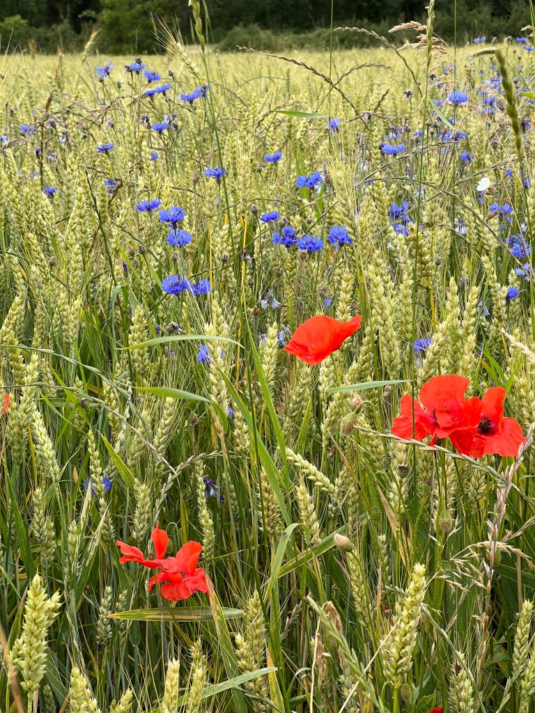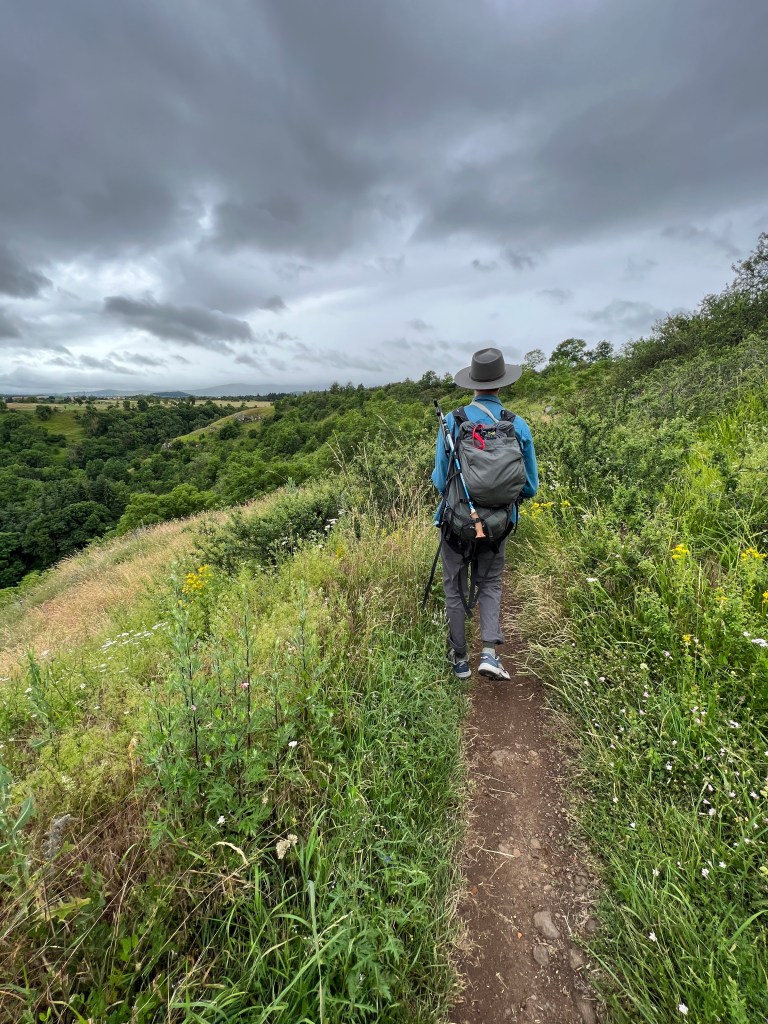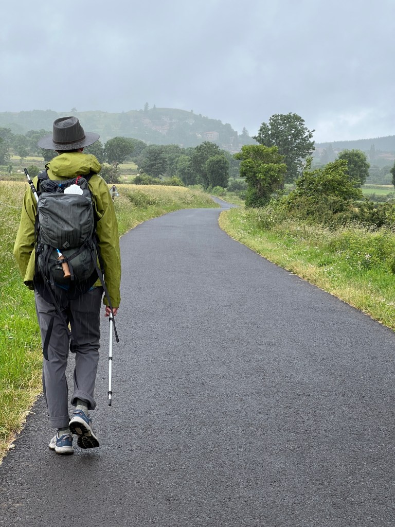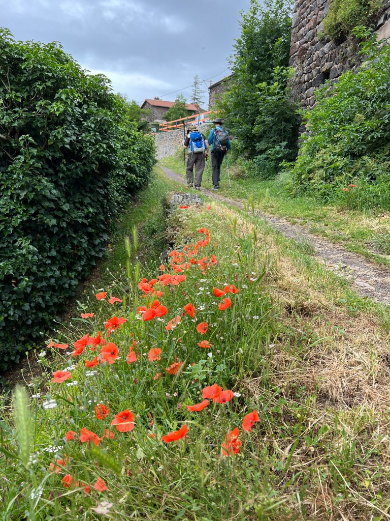 I’m not even sure where to begin. Today was a multitude of days all contained within about 10 miles of waking. We started in Le-Puy-en-Valley and ended in Montbonnet, crossing farmlands, fields, tiny villages, and many hills. The day was relatively cool (low 60’s) and it rained on and off throughout the morning and afternoon. The scenery was spectacular! There were wildflowers everywhere; bursts of yellow and pink and purple and blue and white. There were fields of light green and dark green and muted yellow and bursts of bright blue shining through dark clouds. The rain was mostly mist but also occasionally came down in heavy sheets.