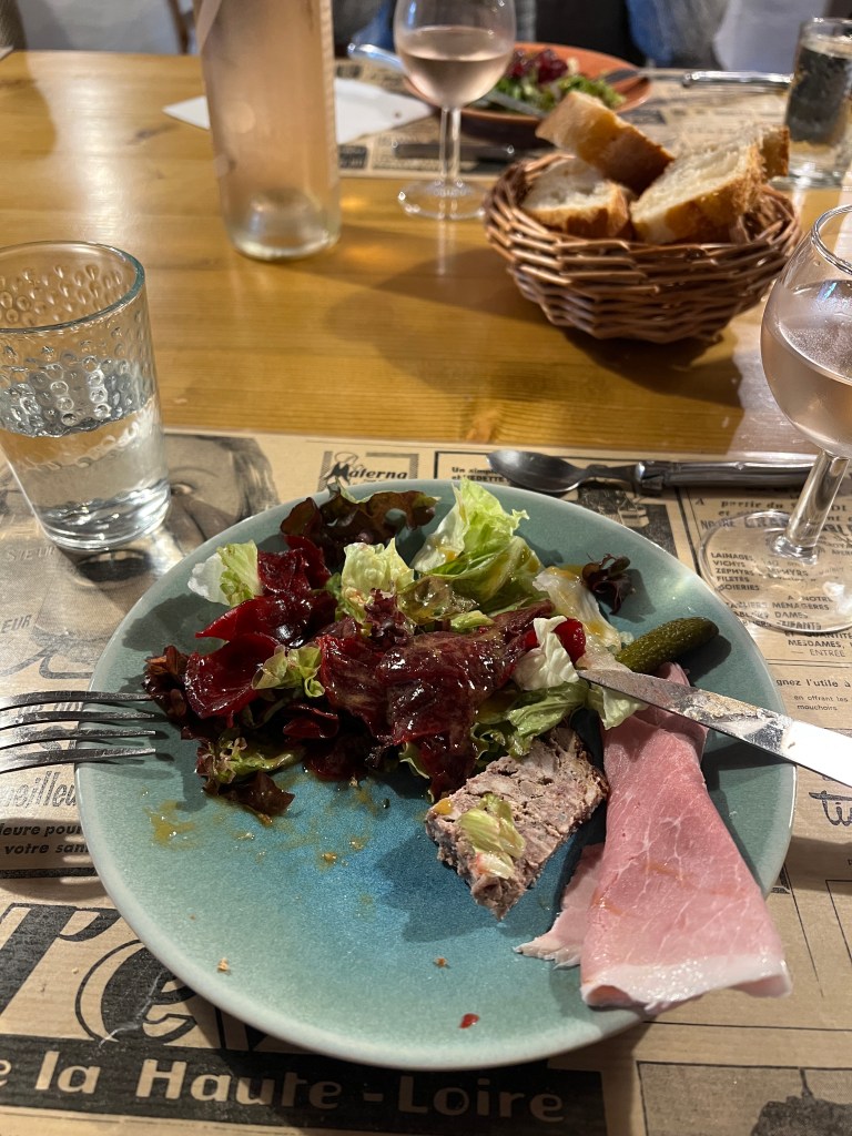 A few miles into our walk, we met a lovely couple from Australia and we ended up (serendipitously) staying at the same Auberge in Montbonnet (La Barbelotte). We were the only four people staying the night, which makes me think that booking 3 months in advance may have been unnecessary. We had a lovely three course meal, which included a salad and local charcuterie, baked chicken with gravy and fries, perhaps the best ice cream I have ever had (praline), and an after dinner digestive (Verveine), which was a dark green, herbal liqueur that was a specialty of the region. We drank local wine and talked for hours about our lives and the world.
