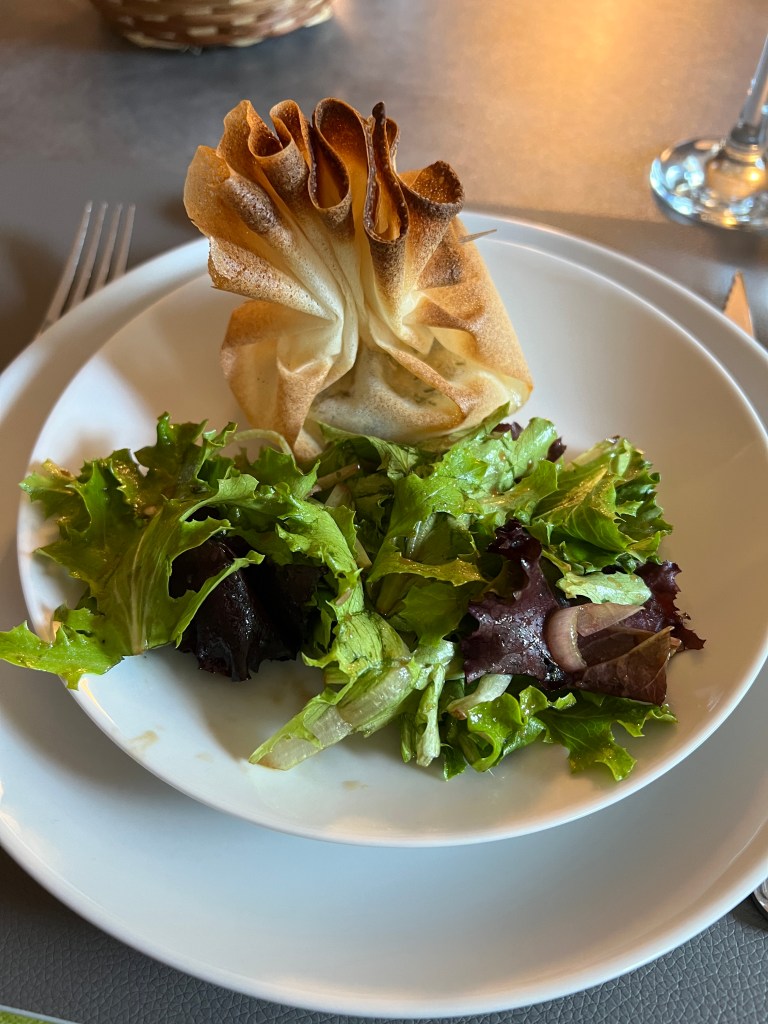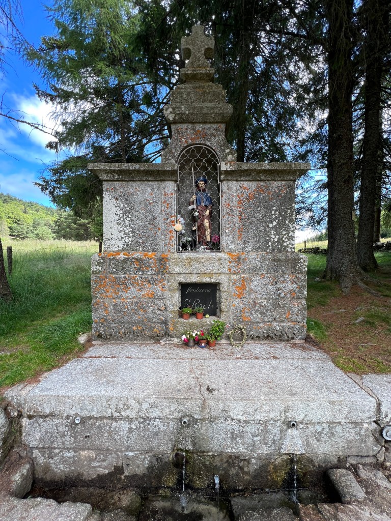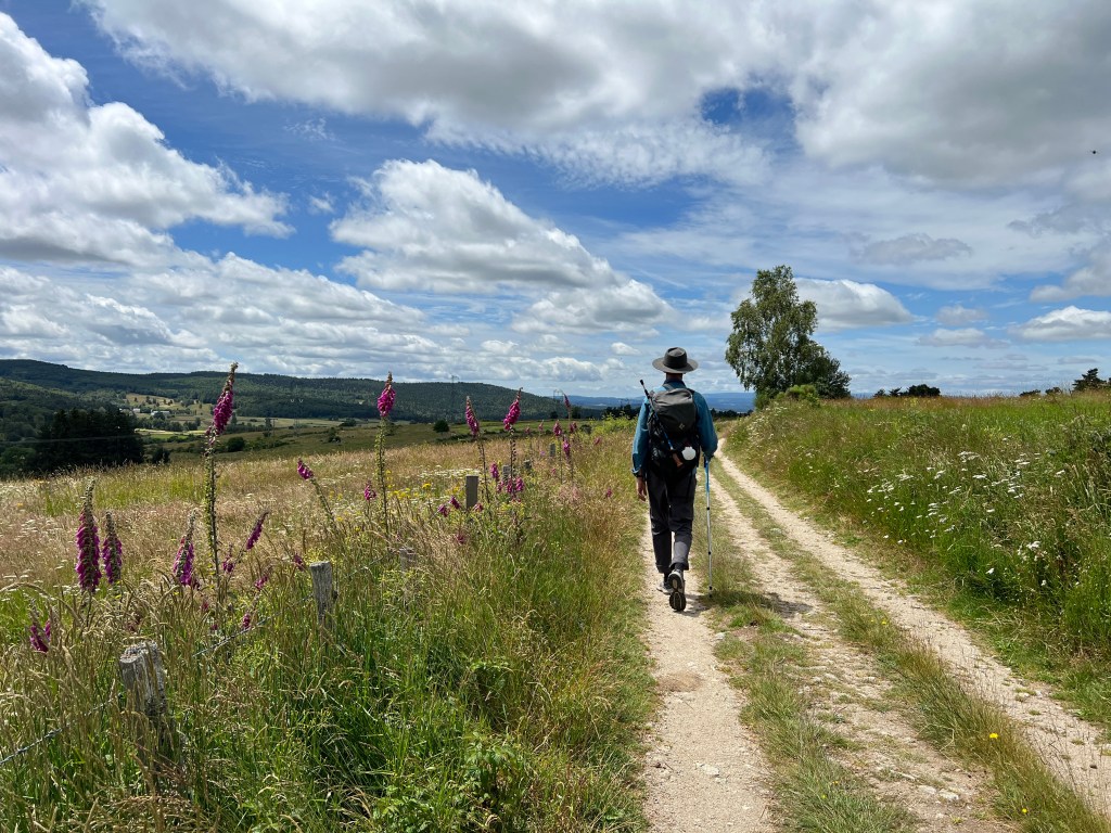 The day began with a light, misty rain and lovely forested paths. We stopped for tea and ice cream at Domaine du Sauvage, a well known, and loved, pilgrim accommodation along the way. We continued through managed forests and open fields and I think our bodies are starting to feel the strain of walking about 50 miles at this point. I wish I had scheduled a rest day a little sooner, but oh well, we are managing and are still having an amazing time. All in all, today ended up being about 2 miles longer than the guide books said and we felt it. Luckily our dinner (at Les Drailles de la Margeride where we were staying) was once again amazing: salad with a handmade chèvre and honey pastry, pork and mango curry, a cheese course, and possibly the best crème brûle I have ever had. I also finally found a French cider! This isn’t really the region for them, but I’ll keep looking!