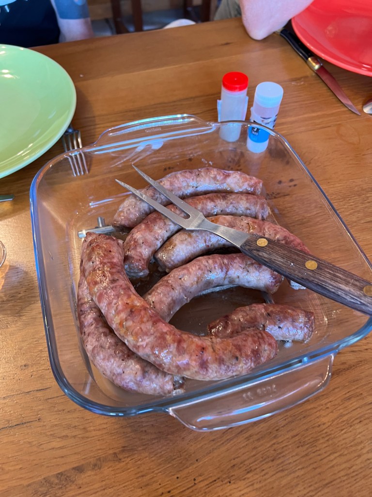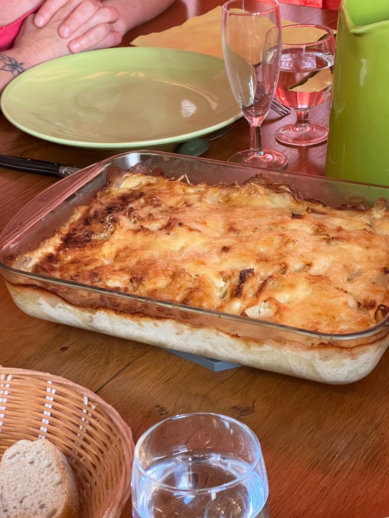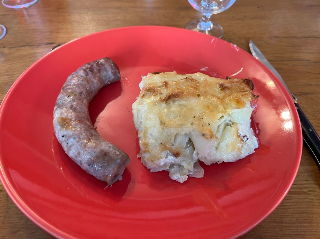 Tonight we stayed at a more traditional Gîte, Sentiers Fleuris, and enjoyed a communal dinner of homemade potato, leak, and lovage soup (lovage from the garden), local sausage, potatoes au gratin, and crème brûle. We were glad the dinner only lasted about an hour (they often go for 2+) so we could turn in early and prepare for our first 15 mile day tomorrow across the Aubrac Plateau.
