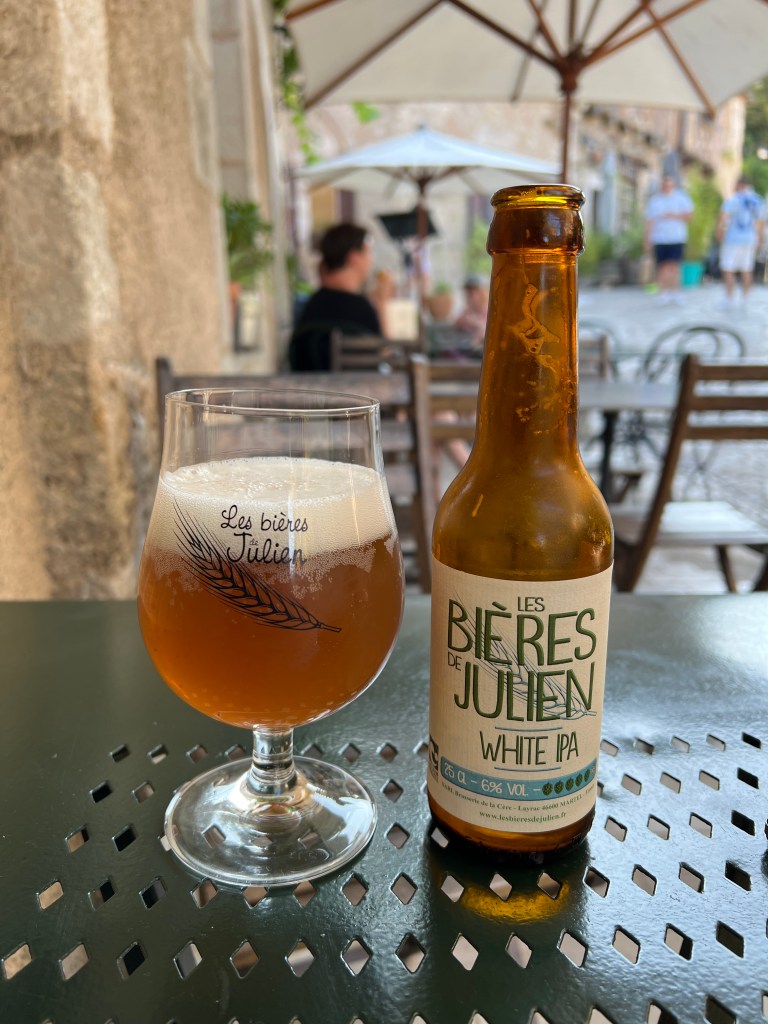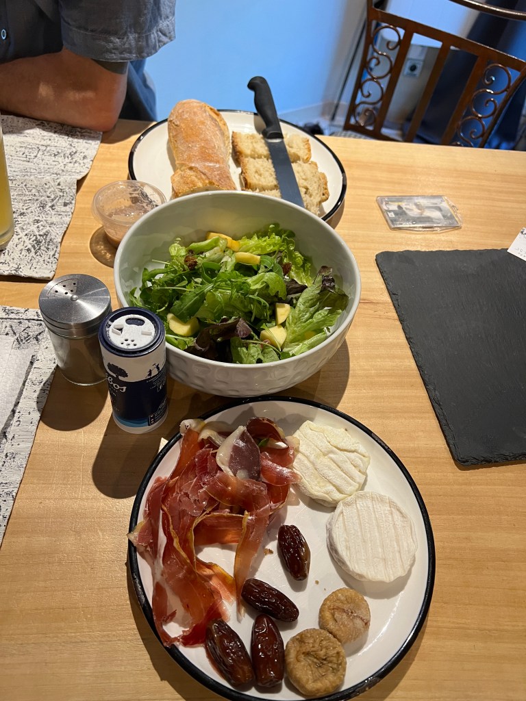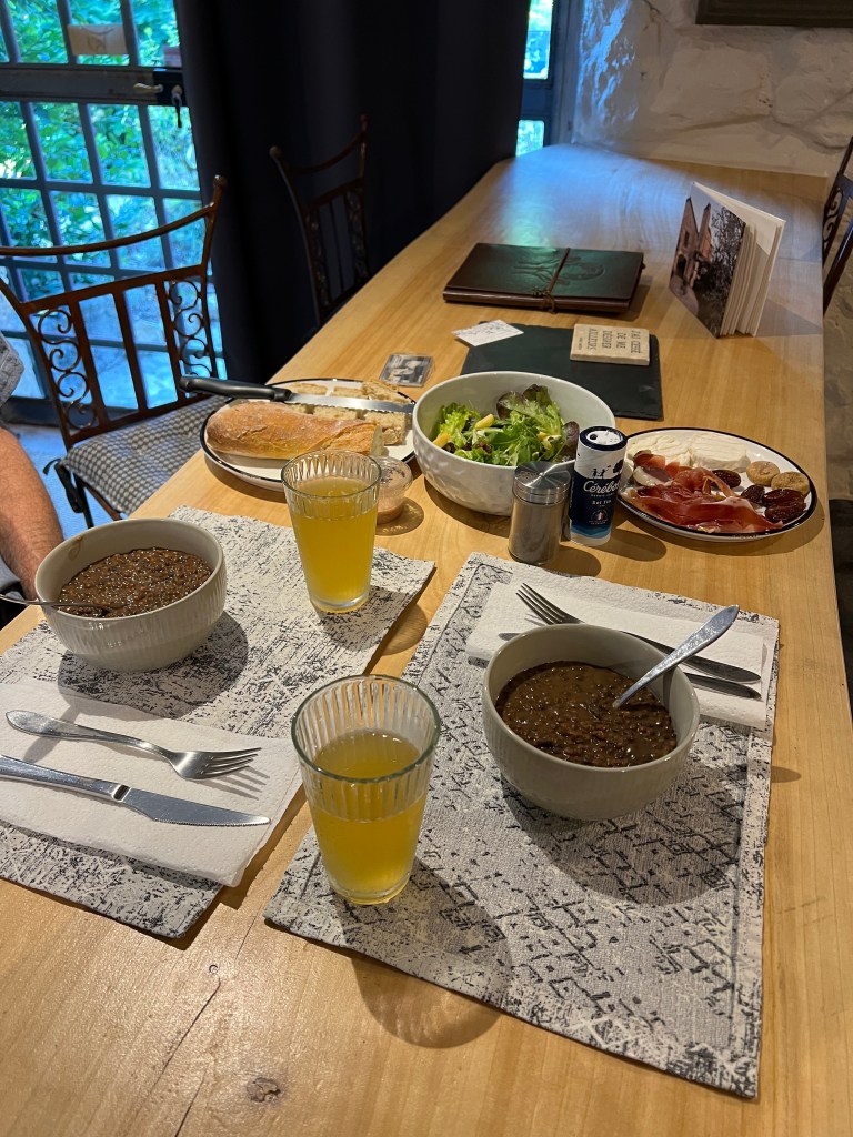 For dinner, we were excited for something simple and in our own space. While dinners in France are amazing, they are also a bit of a production that lasts at least two hours. We had a quiet meal of lentils, bread, cheese, ham, and salad. We drank local beer and Côtes du Lot rosé and watched the sun set over the village.