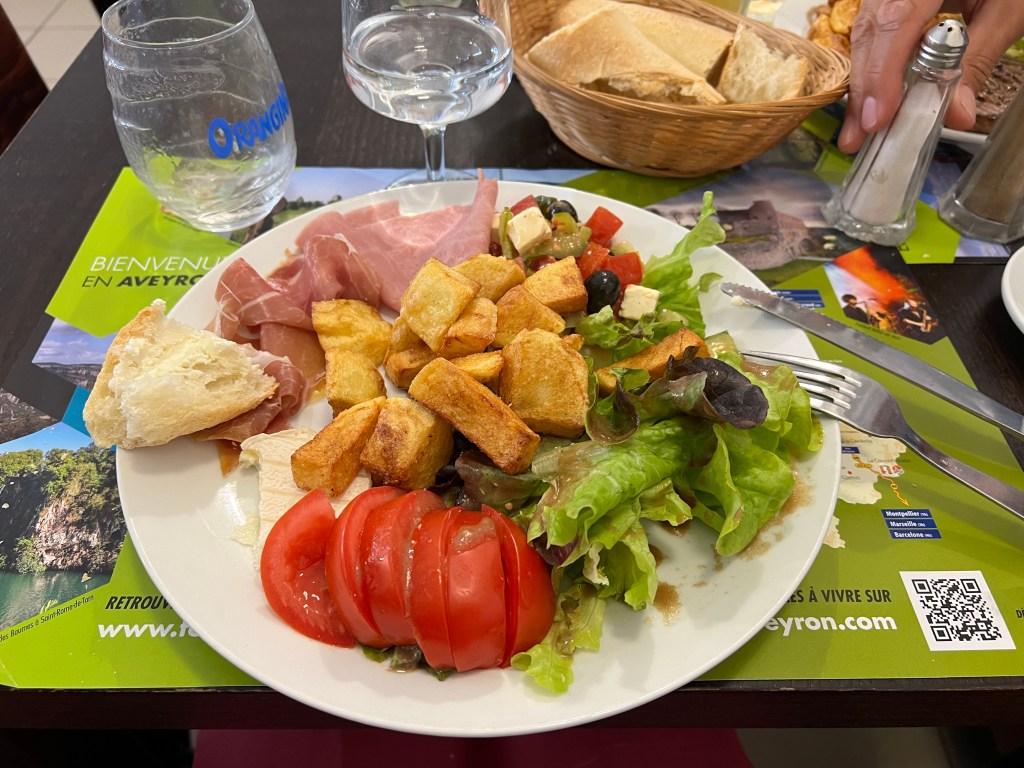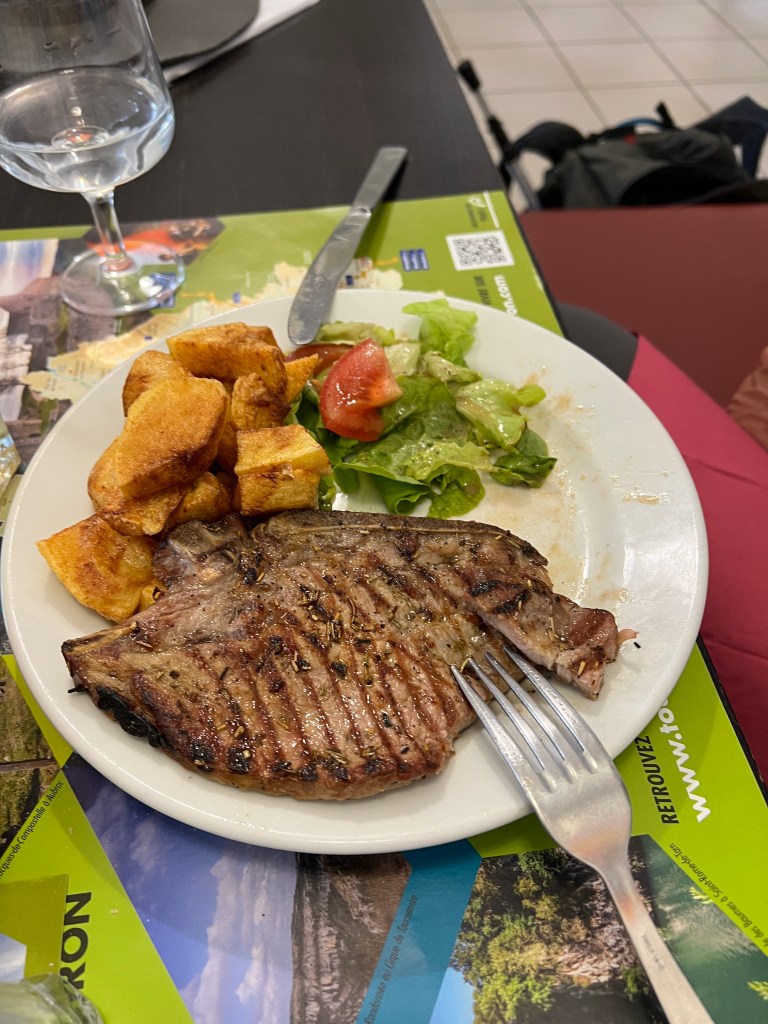 Today was only the second time we found a place to eat a sit-down meal along our route for lunch, and it saved the day! Breakfast had been particularly sparse (French breakfast tends to be bread with butter and jam, yogurt, coffee/tea, juice, and maybe a coffee cake. If you are extra lucky, you might get some cheese and meat, but that’s rare. Croissants are always a treat, but also fairly rare) and my yogurt with coffee cake was not giving me the energy I needed to walk 15 miles.