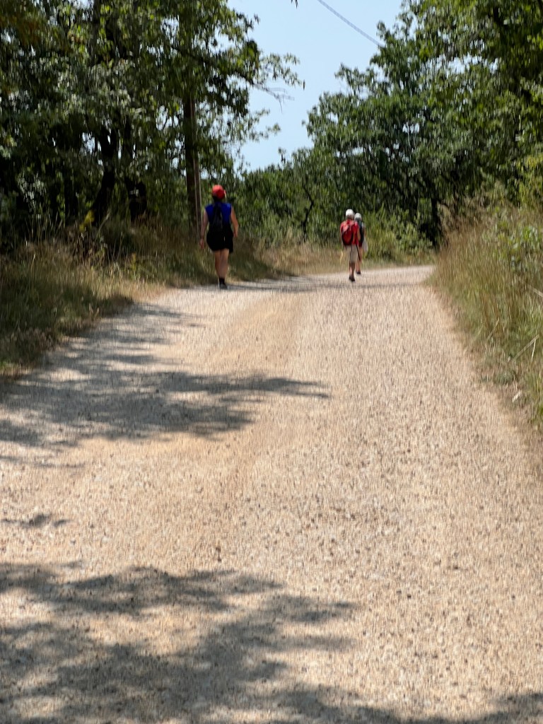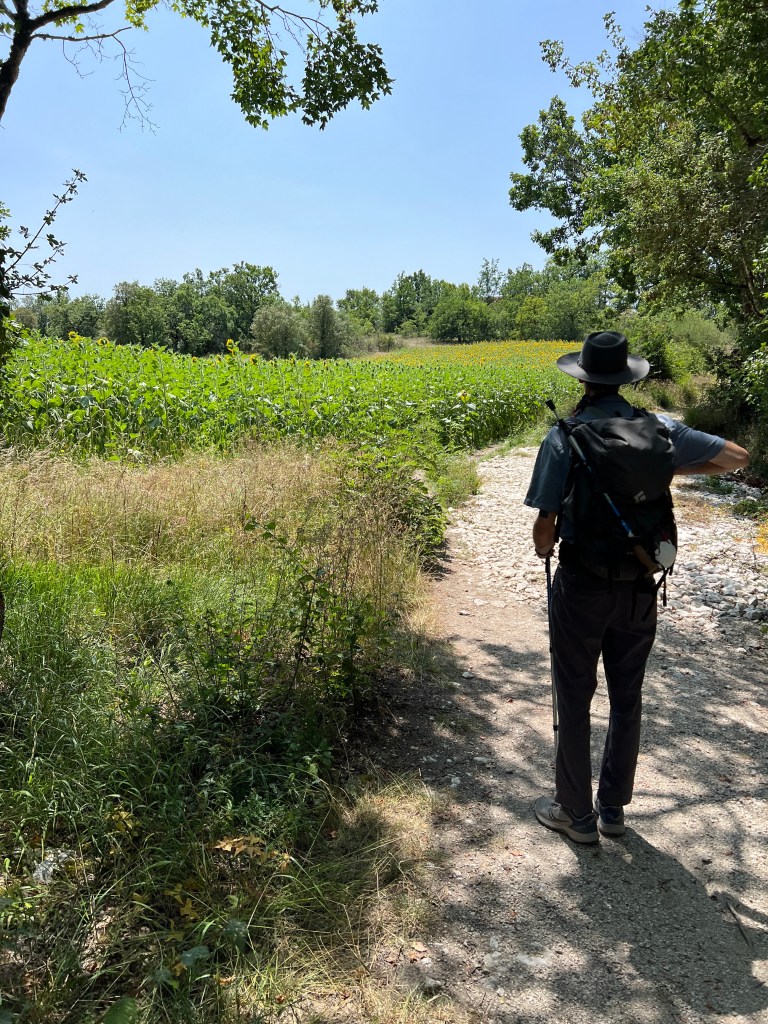 The last two days were long days, and today was long and very hot and probably one of the more challenging days we have had yet. Despite the high temperatures (into the 90s), we decided we would walk and do our best to stay cool and hydrated. With only two days left, we didn’t want to miss out on being immersed in this place. I was also promised sunflowers by my guide book, which would make even the biggest challenge worth it.