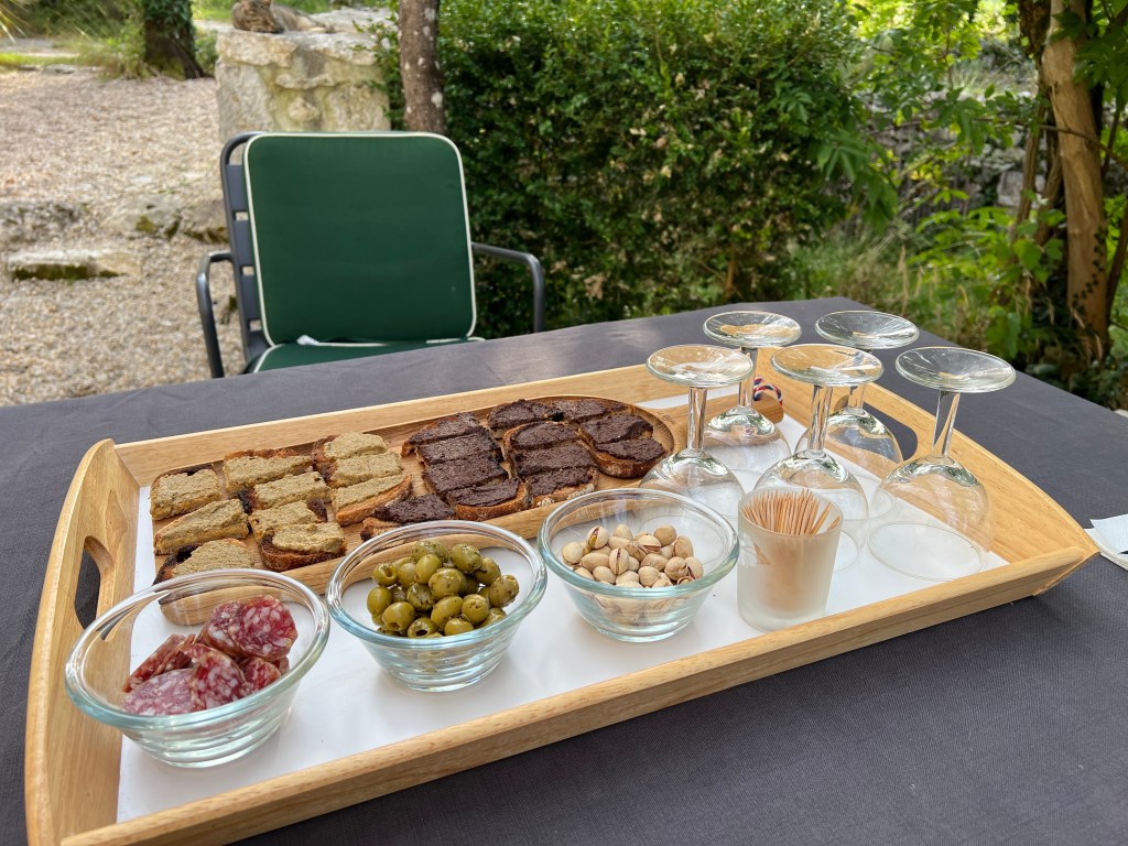 Our accommodation for the evening was absolutely fabulous! We stayed at the Chambre d’Hôtes, Les Hauts de Lascabanes. Our little cabin was like staying in a treehouse. Our hosts were, of course, wonderful and prepared a delicious meal of shrimp, rice, and veggies. They also shared copious amounts of local rosé, which we fully enjoyed! There was one other couple, and their 14 month old son, staying the night. They were British living in Antigua and on holiday in France. It was nice to be able to converse in English for the evening, something quite rare on this trip (and of course not the reason we came to France, but nice all the same). Our evening concluded with warnings of a Thunderstorm, which ended up being quite the event! We were woken up around 3am to giant hail, brilliant lightning, and cracking thunder.